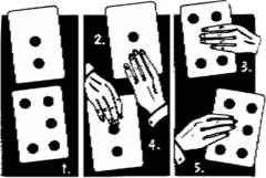 To perform, place your fingers over the bottom spot (Fig 2). Show the card and say “One spot here.” Place your other hand over middle spot (Fig. 3) as you flip the card over (from left to right) and say “Four spots here.” Flip the card over again (this time bottom to top); but this time cover the empty space (Fig. 4), say “Three spots here.” Flip again covering the space (left to right) to show six spots (Fig. 5) Say “Now there are six spots.” You may repeat the entire sequence, if you wish.